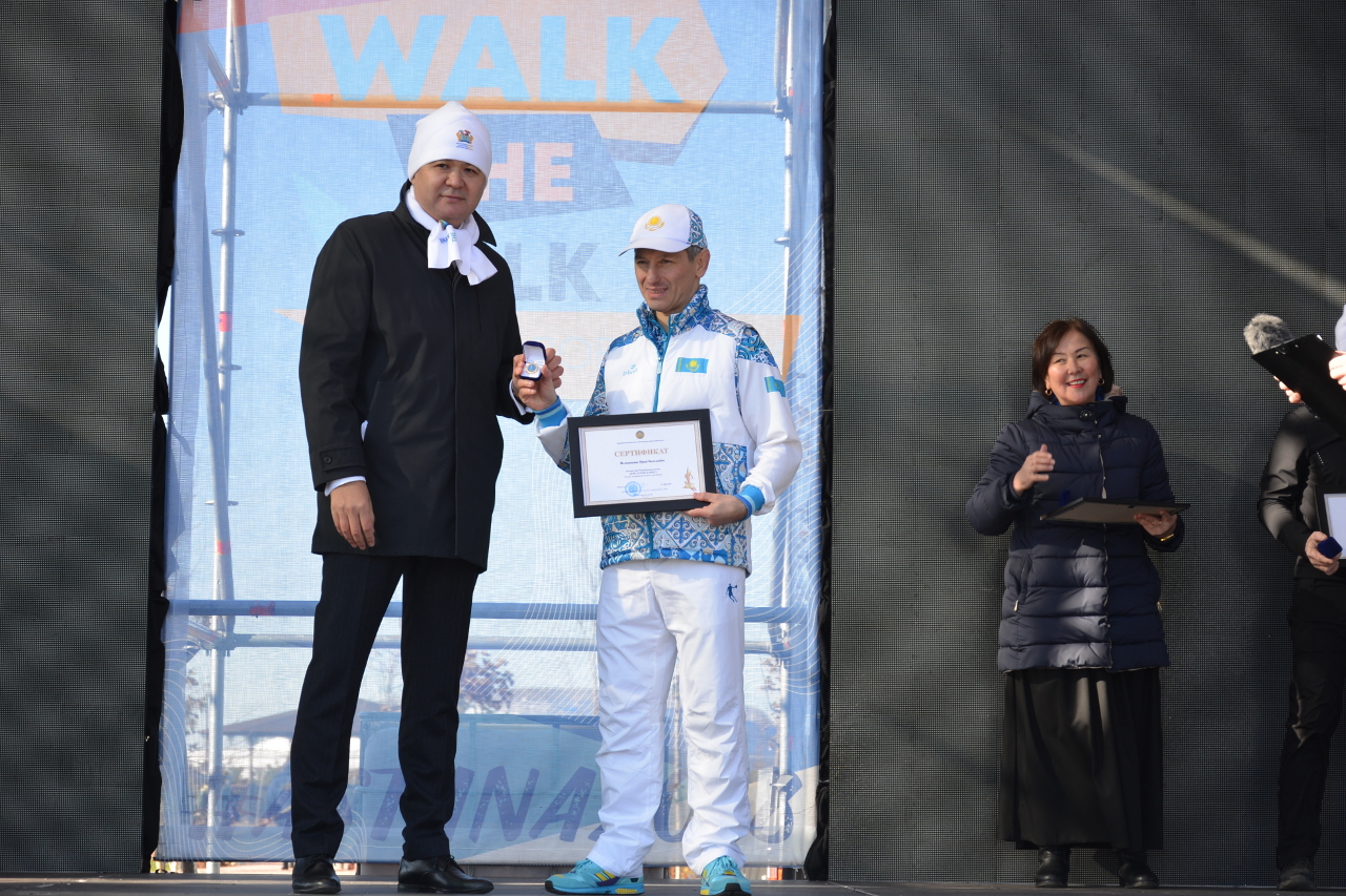 Затем Елжан Биртанов вручил олимпийскому чемпиону по греко-римской борьбе Юрию Мельниченко, 7-микратному рекордсмену Книги рекордов Гиннеса, единственному человеку на планете, который в одиночку пробежал крупнейшие пустыни мира Марату Жыланбаеву, капитану команды КВН «Спарта-Астана», первому чемпиону Высшей лиги 2017 года в РФ Данияру Жумадилову нагрудные знаки и сертификаты Посла здоровья РК.