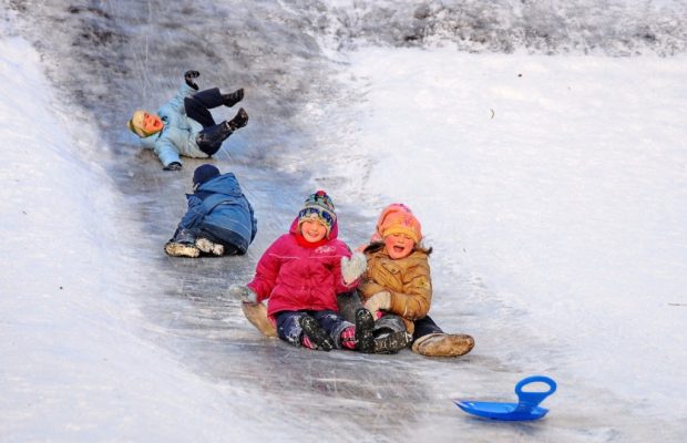 Спуск не должен выходить на проезжую часть, малышей лучше катать с маленьких пологих снежных горок, в немноголюдных местах и при отсутствии деревьев, заборов и других препятствий.