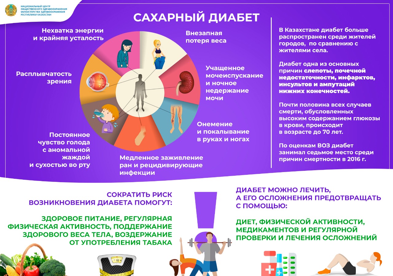 Сахарный диабет является самым распространенным эндокринологическим заболеванием в мире и развитие его связано с нарушением обмена углеводов в организме. Диабет возникает, когда организм не может справиться с уровнем сахара (глюкозы) в крови. Кровь становится густой, и со временем это может привести к инфаркту, инсульту, слепоте, почечной недостаточности и гангрене нижних конечностей. Сегодня, по данным ВОЗ, в мире насчитывается 422 миллиона диабетиков. Однако, несмотря на серьезнейшую угрозу, которую диабет представляет для здоровья, половина диабетиков даже не подозревают о своей болезни, передает Kazlenta.kz со ссылкой на пресс-служба Национального центра общественного здравоохранения МЗ РК