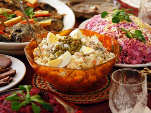 Традиционно продукты у нас закупают перед самым праздником, когда времени уже остается не так много. Поэтому довольно часто в магазинах покупаются и готовые развесные салаты, которые обычно заправляют майонезом или сметаной.