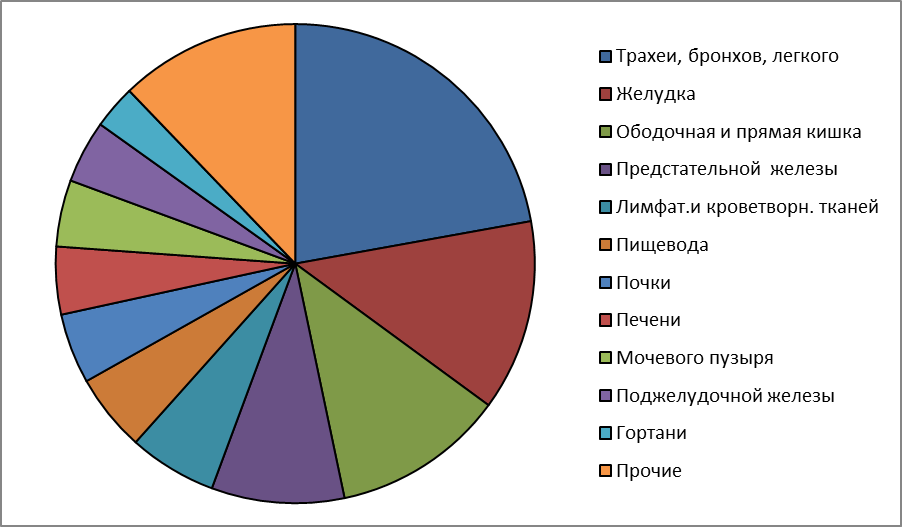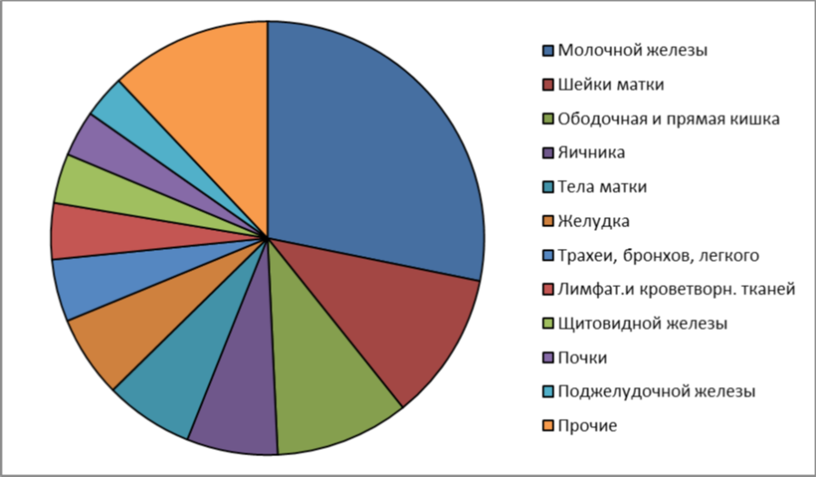 Наиболее распространенными видами рака у обоих полов (перечислены в порядке убывания согласно оценкам новых случаев в 2018 году) являются рак молочной железы, рак легких и бронхов, колоректальный рак, злокачественные новообразования желудка, шейки матки, пищевода, простаты, почки, яичника, поджелудочной железы, эндометрия и печени.