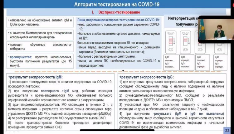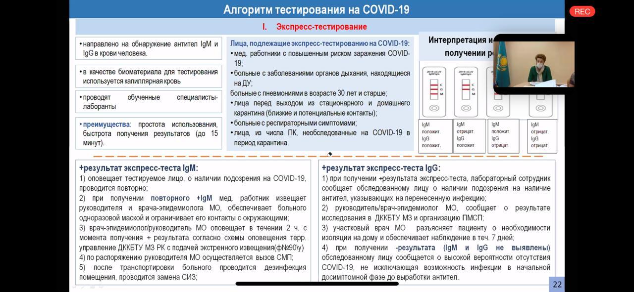 Также, она подчеркнула алгоритм тестирования на COVID-19, которая включает экспресс-тестирование и тестирование методом ПЦР.