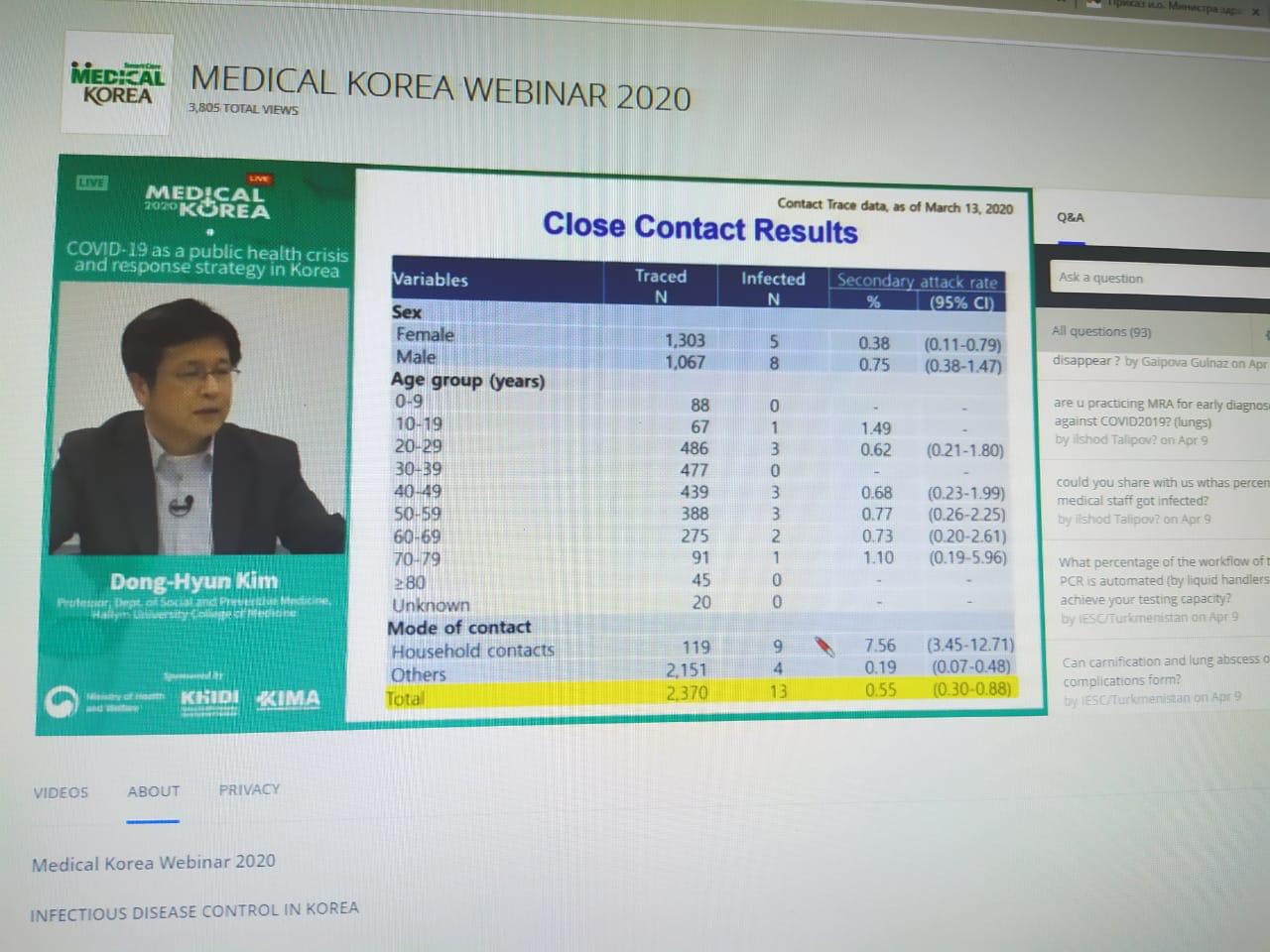 9 апреля в Национальном центре общественного здравоохранения МЗ РК состоялся очередной онлайн – семинар по теме «Контроль инфекционных заболеваний в Южной Корее»