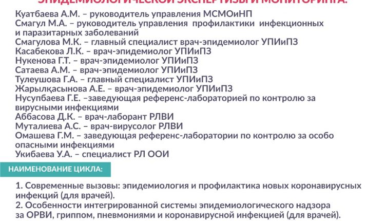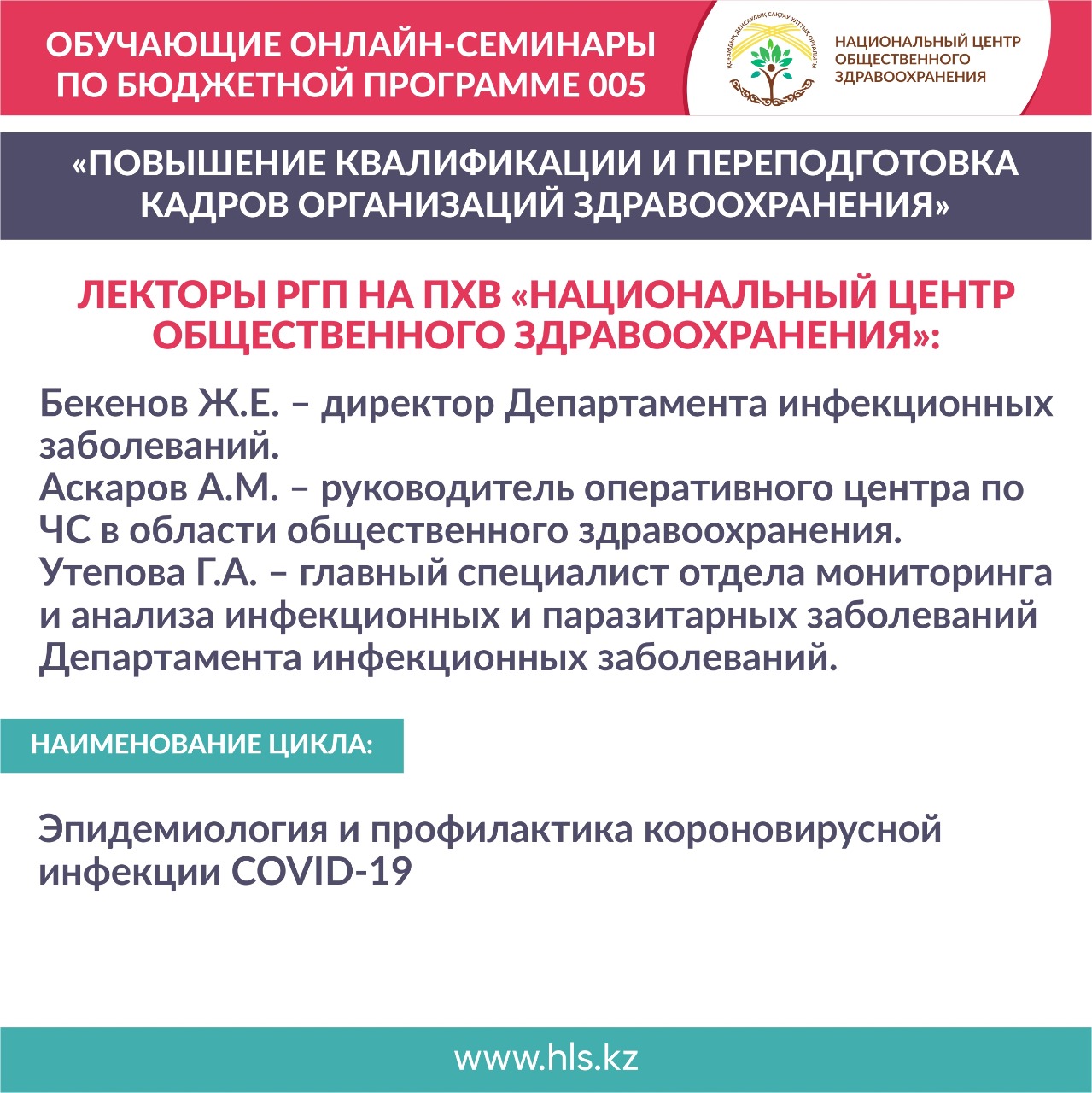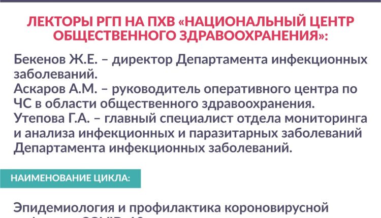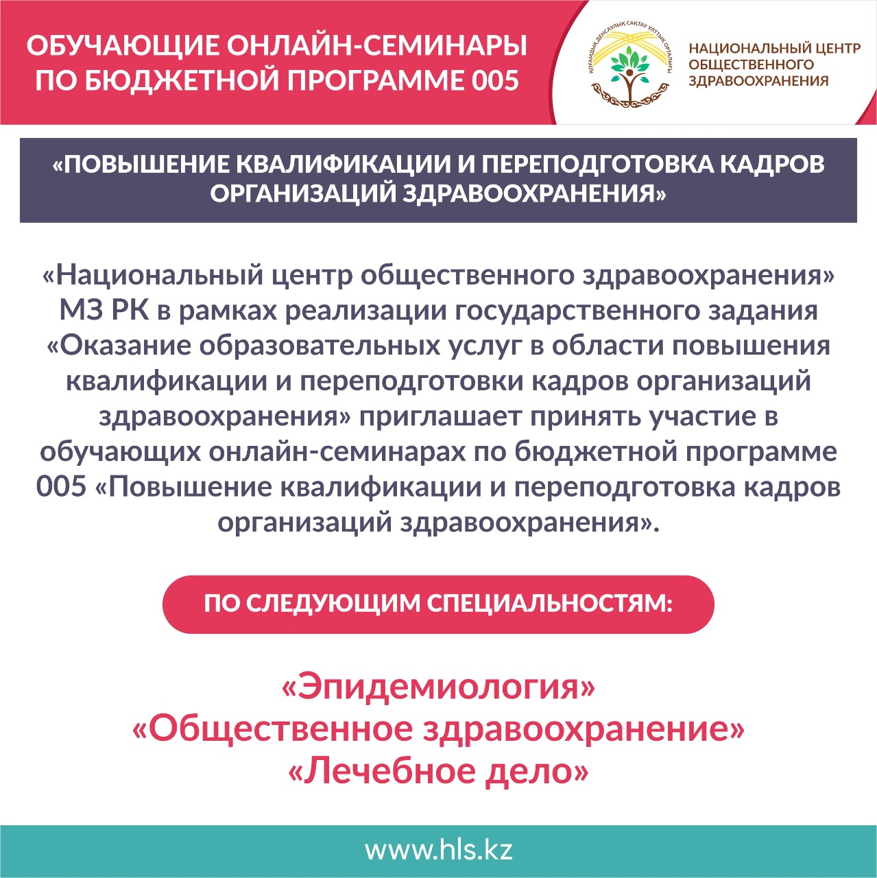 «Национальный центр общественного здравоохранения» МЗ РК в рамках реализации государственного задания «Оказание образовательных услуг в области повышения квалификации и переподготовки кадров организаций здравоохранения» приглашает принять участие в обучающих онлайн-семинарах по бюджетной программе 005 «Повышение квалификации и переподготовка кадров организаций здравоохранения».