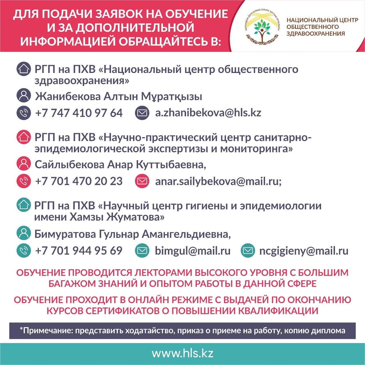 -РГП на ПХВ «Научный центр гигиены и эпидемиологии имени Хамзы Жуматова» – Бимуратова Гульнар Амангельдиевна, тел: +7 701 944 9569, e-mail: bimgul@mail.ru. Официальная почта: ncgigieny@mail.ru