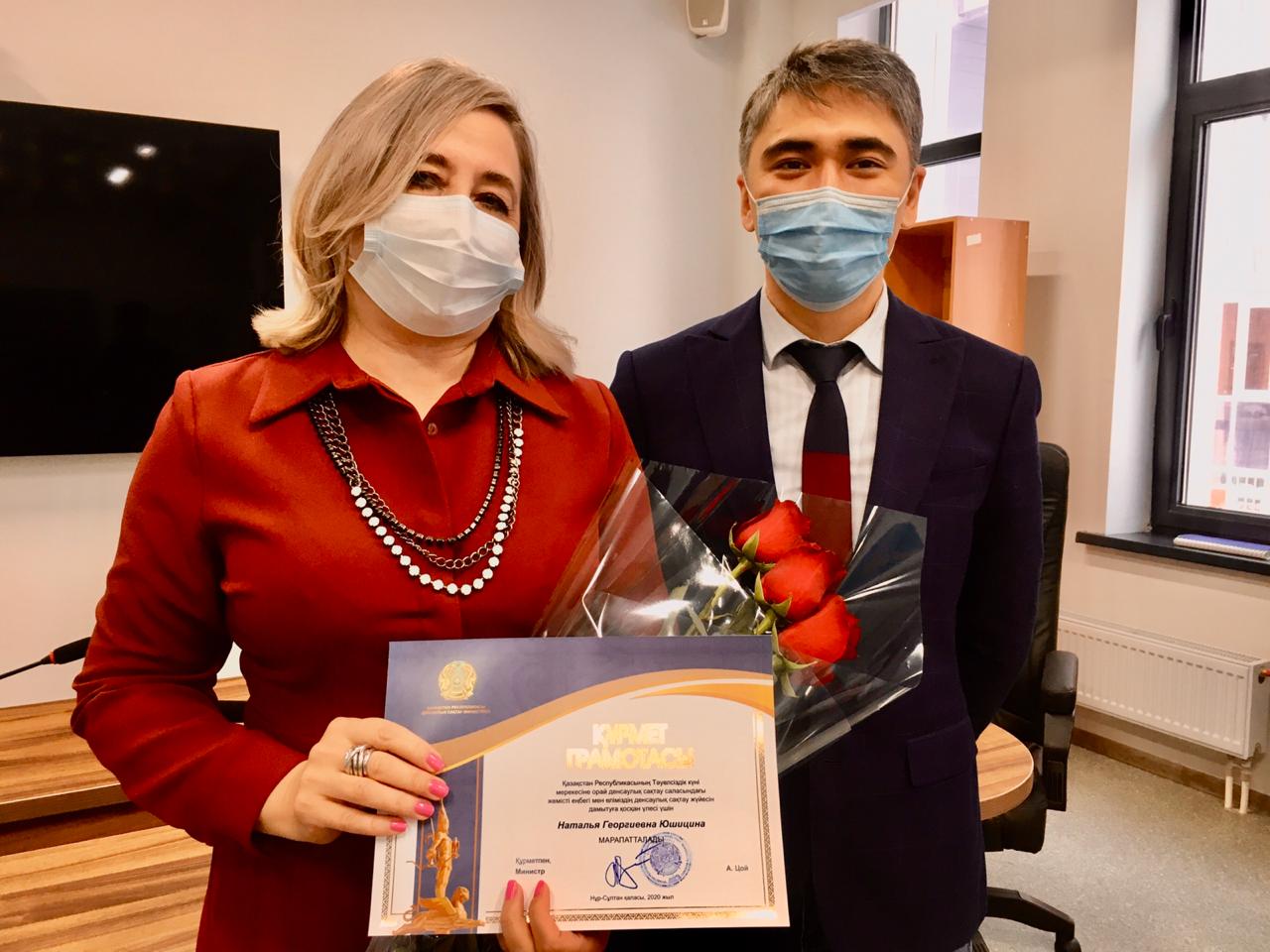 почетной грамотой « Денсаулық сақтау жүйесін дамытуға қосқан үлесі үшін» от имени Министра здравоохранения Республики Казахстан Алексея Цоя руководитель отдела планирования, анализа и оценки Наталья Юшицина.