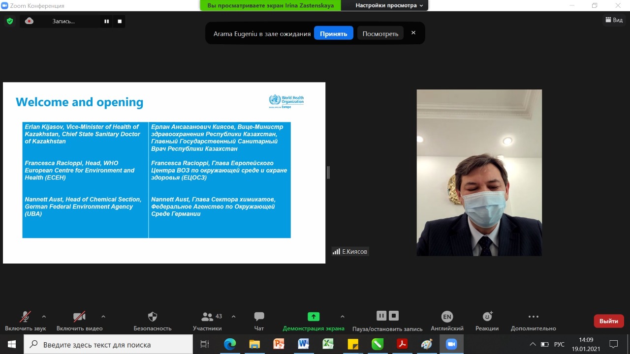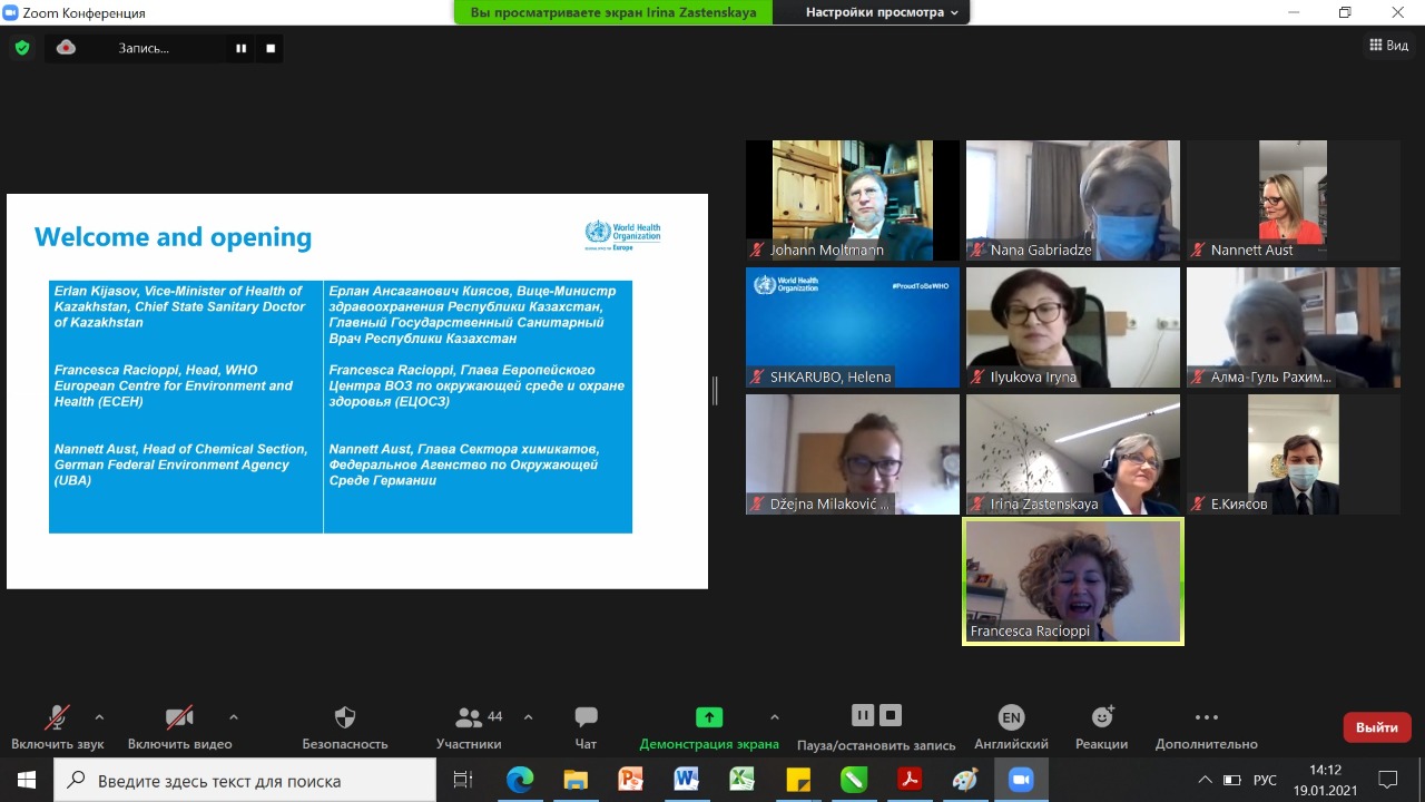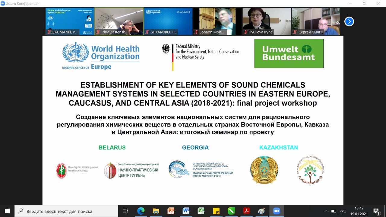 19-20 января 2021 года РГП на ПХВ «Национальный центр общественного здравоохранения» Министерства здравоохранения Республики Казахстан (НЦОЗ) совместно с Европейским региональным бюро ВОЗ провел онлайн-семинар. Темой обсуждения стал завершающийся проект «Создание ключевых элементов национальных систем для рационального регулирования химических веществ в отдельных странах Восточной Европы, Кавказа и Центральной Азии».