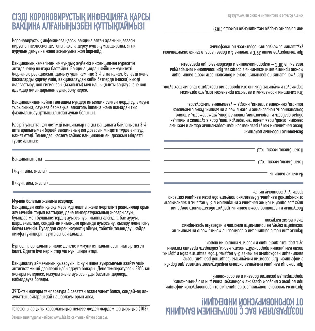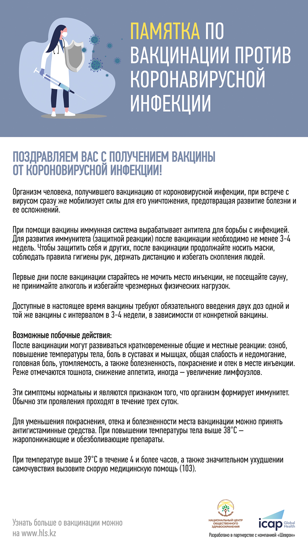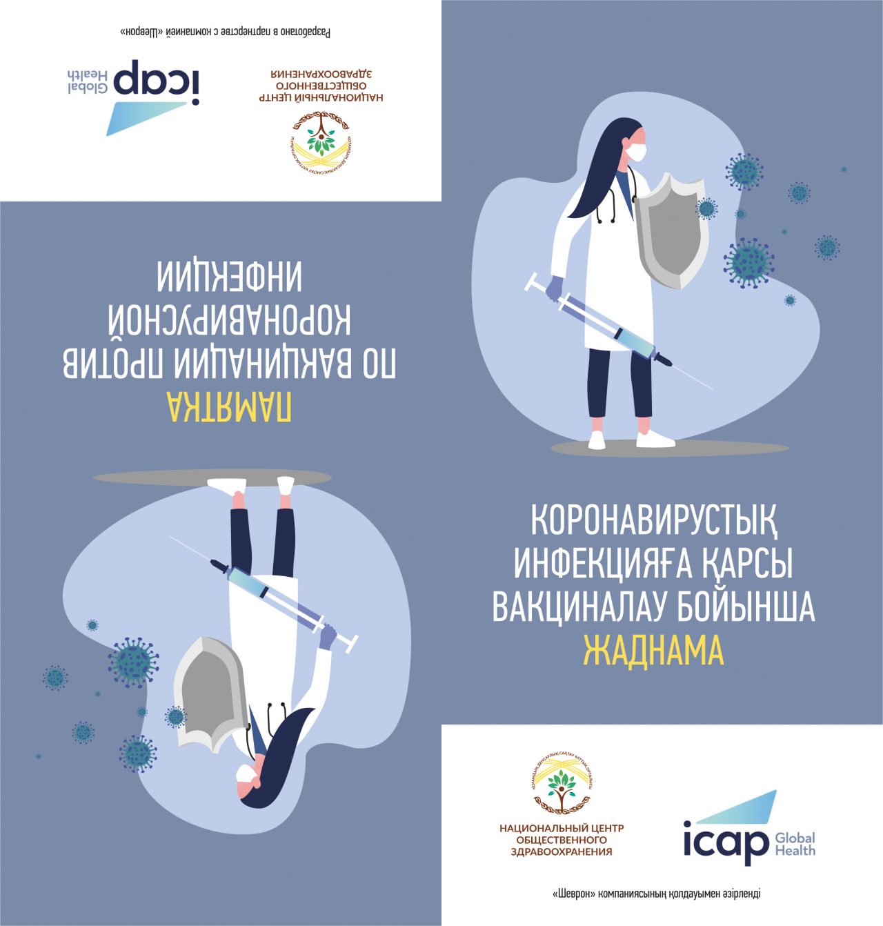 Инструкция по проведению вакцинации против коронавирусной инфекции населения в Республике Казахстан для медицинских работников и памятки пациентам по вакцинации против коронавирусной инфекции разработаны Национальным центром общественного здравоохранения МЗ РК и ICAP при Школе общественного здравоохранения Колумбийского университета в Республике Казахстан в партнерстве с компанией «Шеврон».