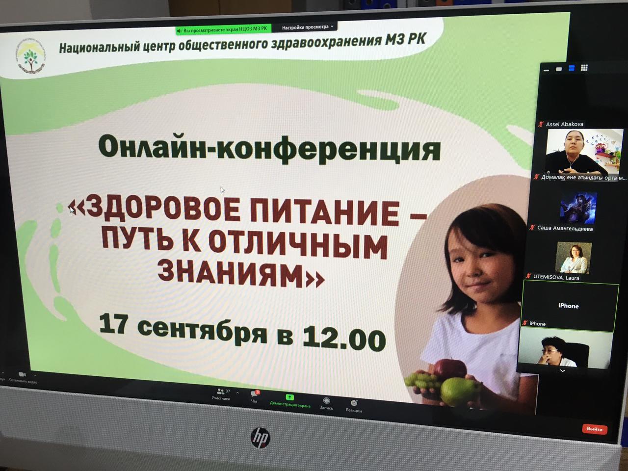 17 сентября 2021 года состоялась онлайн конференция «Здоровое питание – путь к отличным знаниям». Организатором мероприятия стал Национальный центр общественного здравоохранения МЗ РК. Модератором выступила Руководитель Центра укрепления общественного здоровья НЦОЗ Жанар Калмакова.