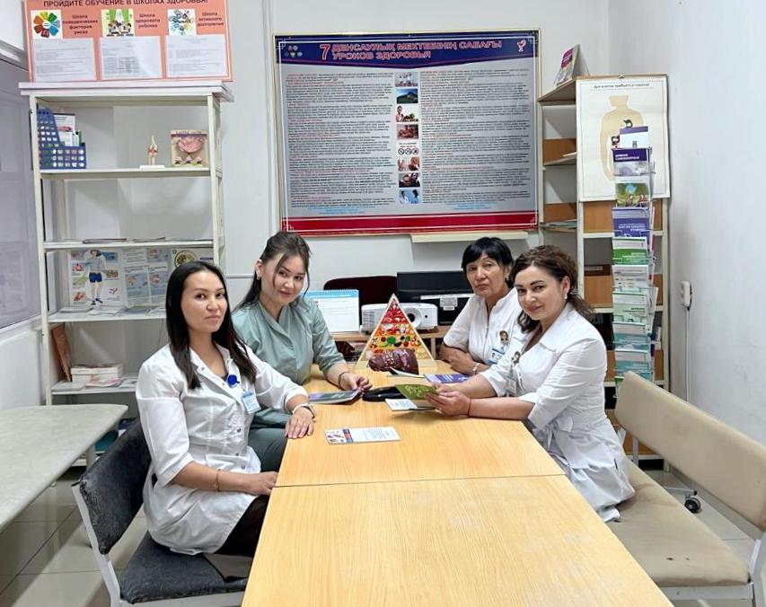 По утверждению Надежды Владимировны, большую поддержку в их работе оказывают руководство, администрация и управляющая компания районной больницы. Для эффективности организации мероприятий имеются необходимая аппаратура, методический материал, проводится обучение сотрудников, создаются благоприятные условия для успешной деятельности. В команде нет людей с вредными привычками, ни у кого нет лишнего веса, то есть все в отличной физической форме, что, в свою очередь, играет немаловажную роль при приеме пациентов. Любое мероприятие готовится и проводится с учетом всех потребностей в получении доступной информации для всех целевых групп (дети, подростки, пожилые, работающие). Сотрудники стараются в доступной форме преподносить материал, причем не навязывают человеку свою точку зрения, а дают ему самостоятельно сделать выбор. Прием пациентов проходит с применением практических навыков или приведением достоверных примеров из жизни. Вся работа ведется согласно разработанному плану Минздрава и Национального центра общественного здравоохранения: месячники, декадники, недели, тематические семинары, тренинги, дебаты, конкурсы в школах и колледжах, Дни открытых дверей для пациентов больницы, выездные акции в местах массового скопления людей, встречи, круглые столы, брифинги, школы здоровья. Скажем, только за прошлый год было организовано 252 мероприятия, а в текущем году — уже 125. Сотрудники кабинета поднимали темы о проблемах курения, наркомании и употребления алкоголя, пропагандировали физическую активность, здоровое питание, профилактировали ОКИ, ОРВИ, травматизм, отравления, туберкулез, вирусный гепатит, разъясняли проблемы ВИЧ/СПИД, онкологических заболеваний, диабета, бронхиальной астмы, вакцинации. Сейчас в ЦРБ работают 11 школ здоровья, обучение в которых в этом году прошли 520 человек. Занятия проводятся мультидисциплинарной командой, состоящей из участковых врачей, медицинских сестер, психологов и узкопрофильных специалистов. После обучения в школах здоровья у лиц с поведенческими факторами риска и хроническими патологиями формируются умения и навыки по самоконтролю за состоянием здоровья, оказанию первой доврачебной помощи в случаях обострений и кризов.